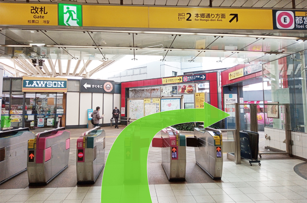 駅改札出口を出ましたら、右手の「出口2本郷通り方面」へとお進みください。