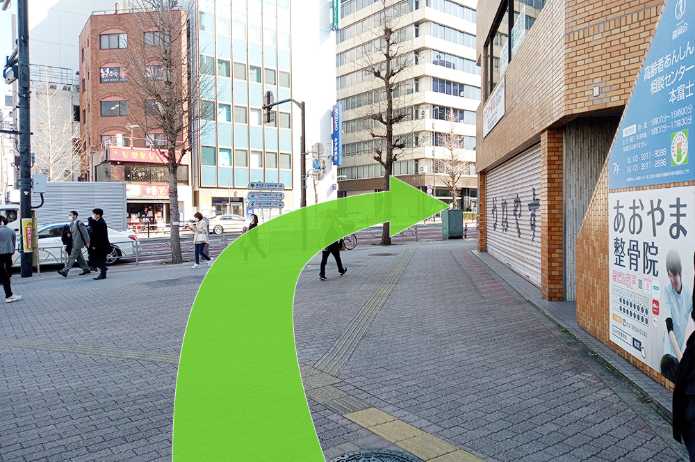 大江戸線ご利用の方は3番出口から外に出ます。まずは右へお進みください。