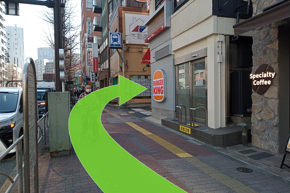 しばらく道沿いに歩きますと、角にバーガーキングが見えてきますので、ここを右折してください。