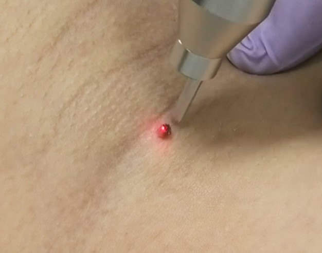 短時間に高エネルギーをピンポイントで照射するので、施術時間が短く、デキモノ周囲への皮膚組織の損傷を最小限にします。